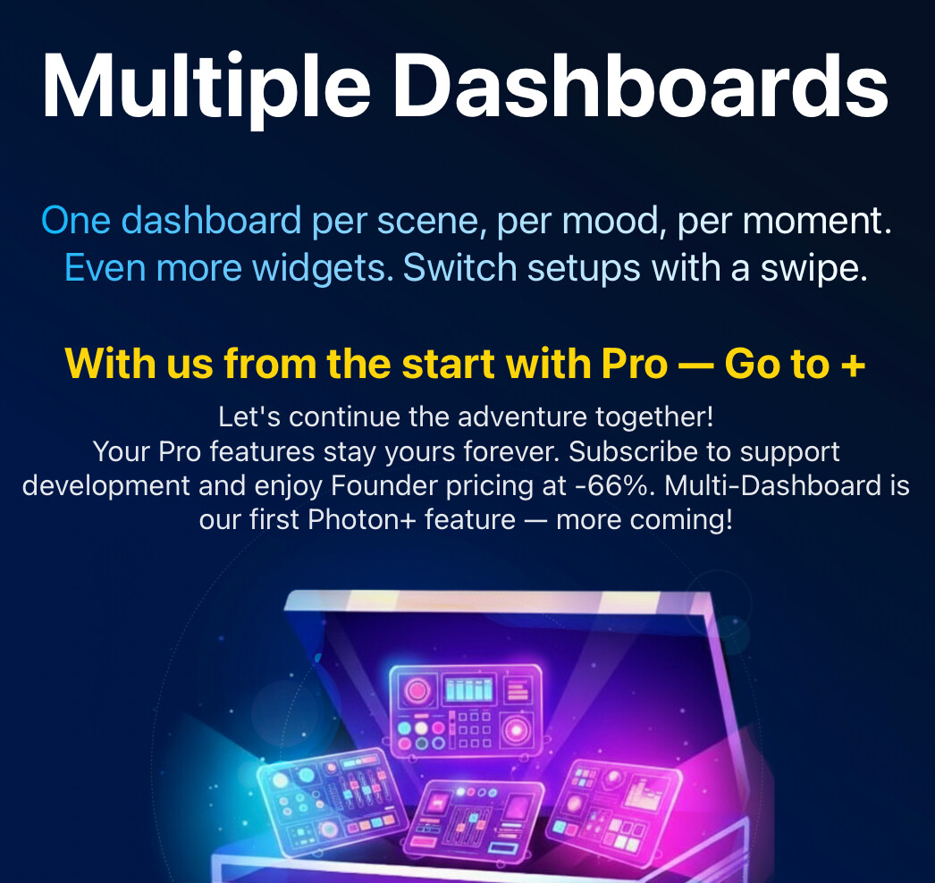 It will include all Pro features (of course) and the first feature is Multi-Dashboard Support. You’ve been asking for this! Create multiple dashboards for different venues or setups, and swipe between them. It works great.